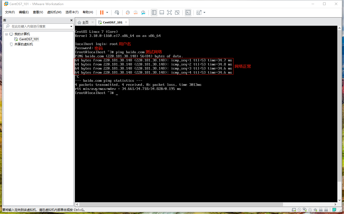 系統(tǒng)開(kāi)機(jī)后,輸入用戶名:root,輸入系統(tǒng)安裝的第五步配置的密碼,進(jìn)入系統(tǒng);輸入命令ping baidu.com測(cè)試網(wǎng)絡(luò)是否正常。注意:因在系統(tǒng)安裝的第三步配置的最小安裝安裝方式,所以沒(méi)有桌面系統(tǒng)