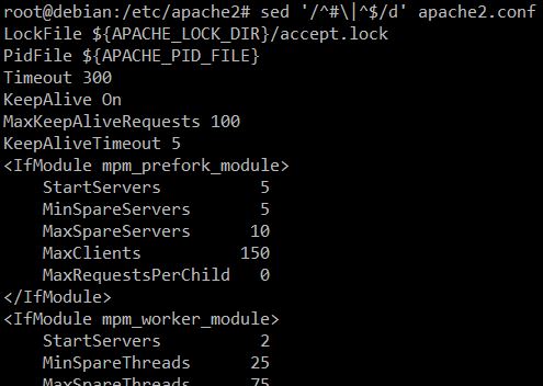 最后,可能有用的技巧是當(dāng)檢查腳本或者配置文件的時(shí)候可以保留文件本身并且刪除注釋。下面的單行 sed 命令刪除(d)空行或者是開頭為#的行(| 字符對(duì)兩個(gè)正則表達(dá)式進(jìn)行布爾 OR 操作)。