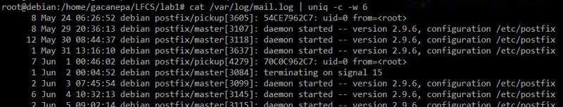 你可以通過使用下面的命令告訴 uniq 比較每一行的前6個(gè)字符(-w 6)(這里是指定的日期)來統(tǒng)計(jì)日志事件的個(gè)數(shù),而且在每一行的開頭輸出出現(xiàn)的次數(shù)(-c)。