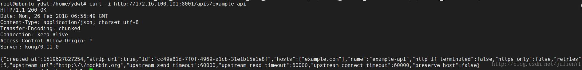curl -i -X POST \ --url http://172.16.100.101:8001/apis/ \ --data 'name=example-api' \ --data 'hosts=example.com' \ --data 'upstream_url=http://mockbin.org'