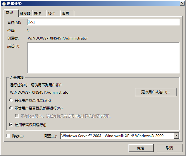 3、在 General 選項(xiàng)卡中選擇 Run whether user is logged on or not,并勾選 Run with highest privileges,然后從下拉列表里面選擇 Windows Server 2003,這里千萬(wàn)不能選擇 Windows Server 2008