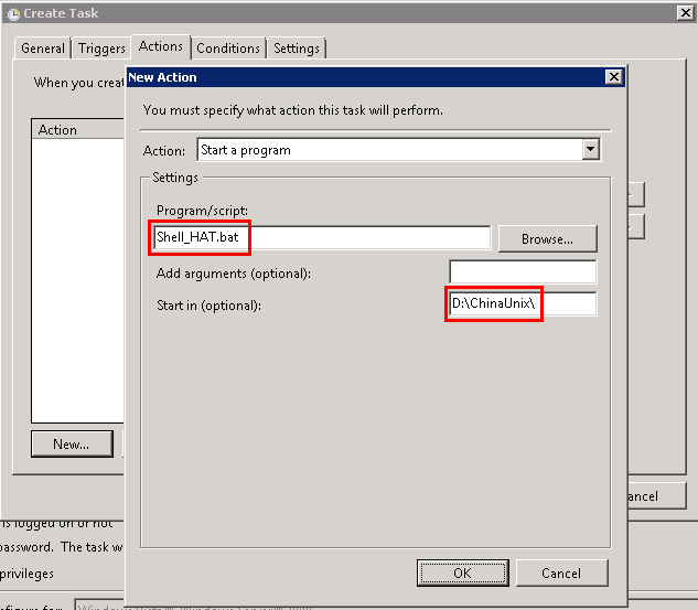 我今天也被這個(gè)問(wèn)題給坑了,幾乎花了一天的時(shí)間來(lái)排錯(cuò)。單獨(dú)執(zhí)行bat腳本一切正常,在Windows 2003的任務(wù)計(jì)劃里面執(zhí)行bat腳本也沒(méi)有問(wèn)題,但是只要放到Windows 2008的任務(wù)計(jì)劃里面就不行。在國(guó)內(nèi)、國(guó)外的網(wǎng)站上一通搜索,終于湊齊了所有的注意事項(xiàng)。步驟總結(jié)如下: