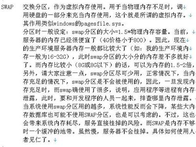 swap 1~2倍,現(xiàn)在服務(wù)器內(nèi)存都比較大的,大于8G服務(wù)器的swap分區(qū)比內(nèi)存略大些就行