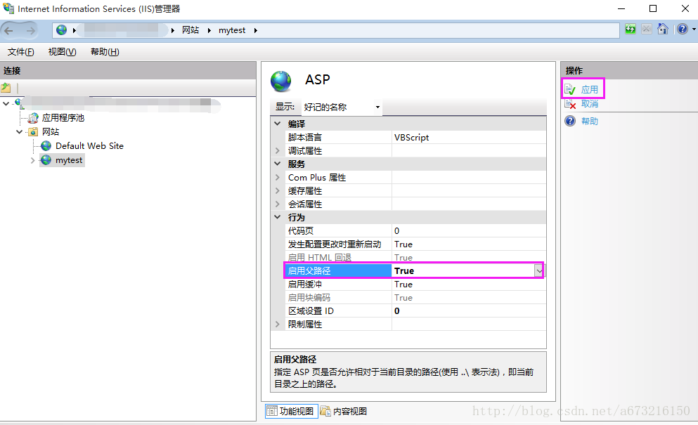 9、IIS中默認(rèn)未啟用父路徑,啟用父路徑才可以在ASP程序中使用相對(duì)路徑。選中“mytest主頁(yè)”下方的“ASP”,右擊“打開(kāi)功能”,將“啟用父路徑”設(shè)置為True,點(diǎn)擊右側(cè)的“應(yīng)用”即可。