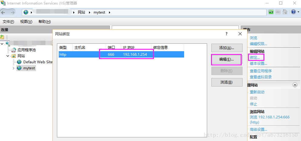 7、打開(kāi)“Internet信息服務(wù)(IIS)管理器”,創(chuàng)建自己的站點(diǎn),右擊“網(wǎng)站”>“添加網(wǎng)站”,設(shè)置如下圖,即可添加成功名稱為“mytest”的網(wǎng)站。