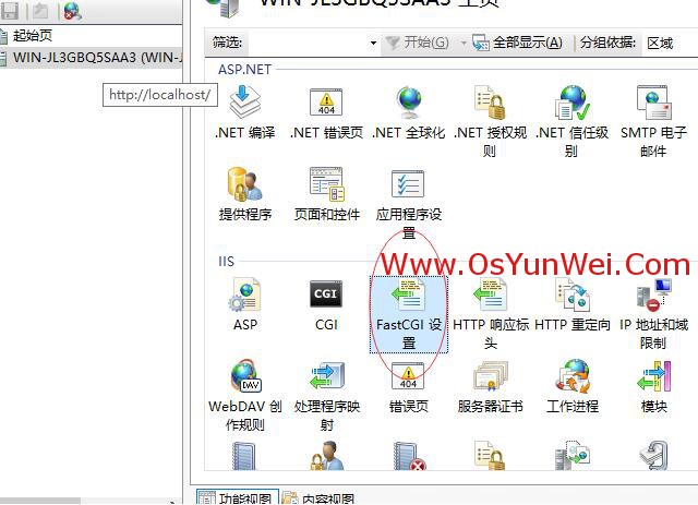 找到中間的IIS部分,打開(kāi)“FastCGI設(shè)置”