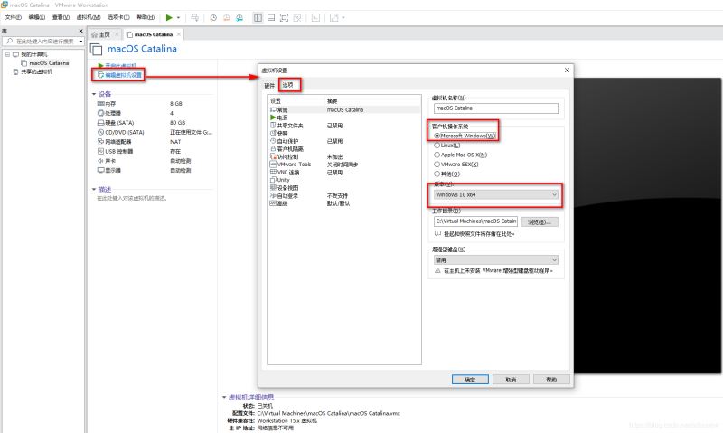 解決方法:首先,關(guān)閉虛擬機(jī);然后,【編輯虛擬機(jī)設(shè)置】——【選項(xiàng)】——【客戶機(jī)操作系統(tǒng)】改為【Microsoft Windows(W)】——【版本】選擇【Window 10 x64】——【確定】
