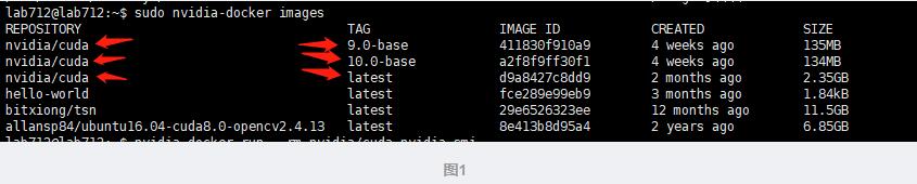 查看自己電腦安裝的鏡像文件,發(fā)現(xiàn)安裝nvidia-docker時,拉取了3個不同標(biāo)簽(TAG)的 nvidia/cuda,如下圖1所示。顯卡驅(qū)動是安裝好的,這里由于我用命令的時候沒有指定 nvidia/cuda 的標(biāo)簽(TAG),所以默認情況下會直接調(diào)用標(biāo)簽為latest 。
