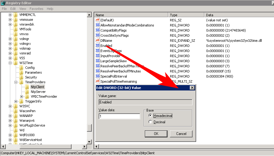 打開注冊表定位到:HKEY_LOCAL_MACHINE\SYSTEM\CurrentControlSet\Services\W32Time\TimeProviders\NtpClient 分支 將enable 值設(shè)為十進(jìn)制1,表示啟用ntp client