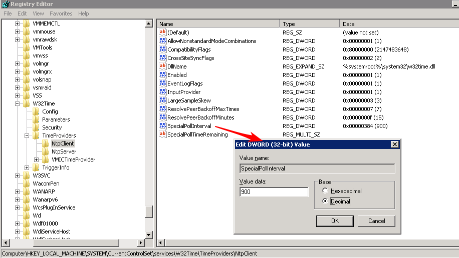 再將SpecialPollInterval的值設(shè)為900,這個值表示多長時間和服務(wù)器同步一次,單位是秒。