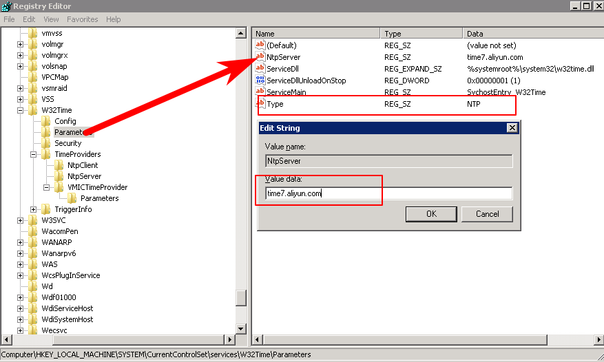 轉(zhuǎn)到Parameters分支下修改ntpserver的值為外部時間源域名或ip地址和Type值為ntp。