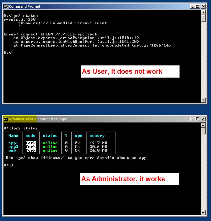 @echo off set HOMEDRIVE=C: set PM2_HOME=C:\Users\***\.pm2 @REM Ensure that pm2 command is part of your PATH variable @REM if you're not sure, add it here, as follow: set path=C:\Users\****\AppData\Roaming\npm;%path% @REM Optionally, you can add 'pm2 kill' just before @REM resurrect (adding a sleep between 2 commands): @REM pm2 kill @REM timeout /t 5 /nobreak > NUL @REM pm2 resurrect @REM otherwise, you can simple call resurrect as follow: pm2 resurrect echo "Done"
