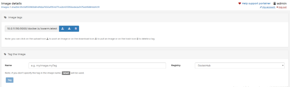 點(diǎn)擊鏡像ID,即可查看鏡像詳情信息,在詳情信息頁(yè)面,除了鏡像的一些信息外,還可以對(duì)該鏡像進(jìn)行打標(biāo)簽tag操作,然后將鏡像push到遠(yuǎn)程倉(cāng)庫(kù)或者私有倉(cāng)庫(kù)中。