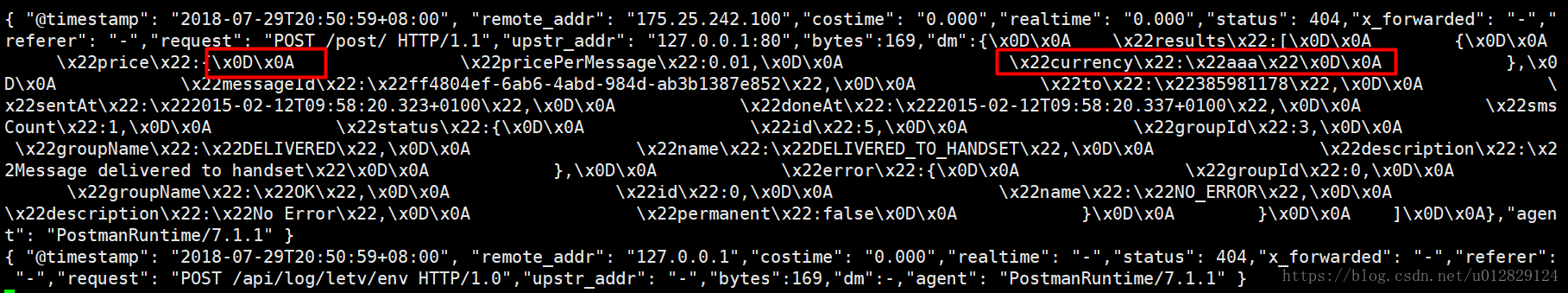 3、設置后post請求,nginx打印參數(shù),發(fā)現(xiàn)參數(shù)雖然打印出來但是有亂碼情況