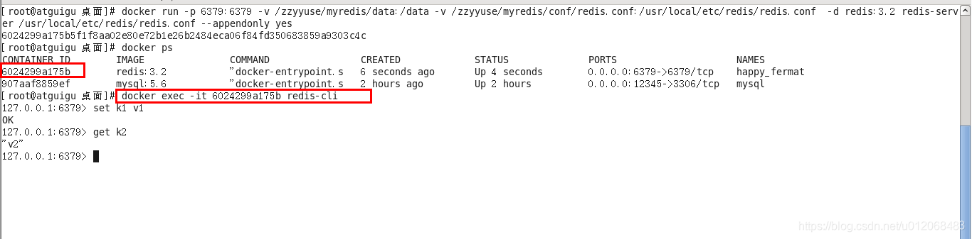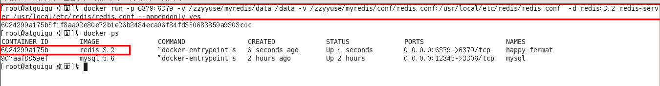 docker run -p 6379:6379 -v /zzyyuse/myredis/data:/data -v /zzyyuse/myredis/conf/redis.conf:/usr/local/etc/redis/redis.conf -d redis:3.2 redis-server /usr/local/etc/redis/redis.conf --appendonly yes
