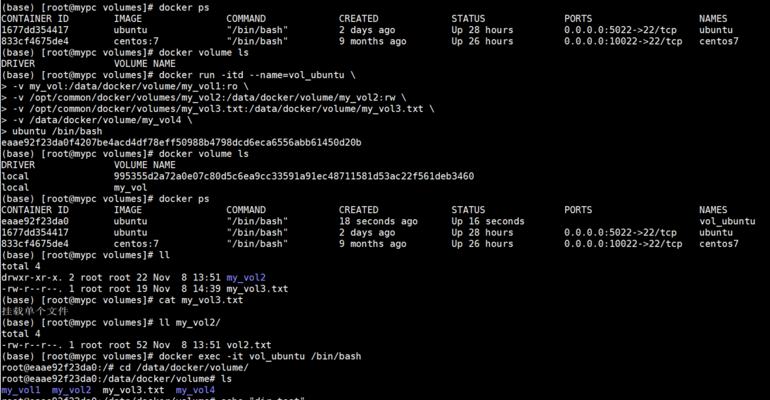 docker run -itd --name=vol_ubuntu \ -v my_vol:/data/docker/volume/my_vol1:ro \ -v /opt/common/docker/volumes/my_vol2:/data/docker/volume/my_vol2:rw \ -v /opt/common/docker/volumes/my_vol3.txt:/data/docker/volume/my_vol3.txt \ -v /data/docker/volume/my_vol4 \ ubuntu /bin/bash