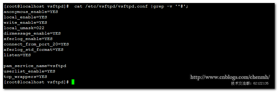 cat /etc/vsftpd/vsftpd.conf |grep -v '^#';