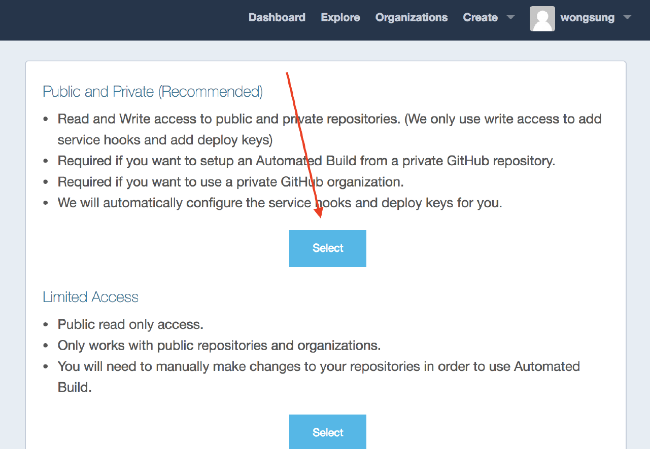 授權(quán)完成后,再次點擊右上角的Create按鈕,選擇Create Automated Build,在打開的頁面中選擇GitHub,如下兩張圖: