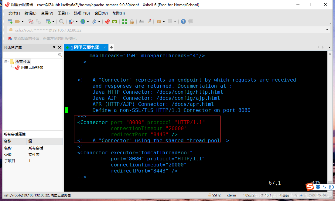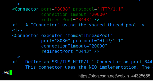 通過vim命令編輯server.xml修改端口,找到下圖8080端口 修改為8088
