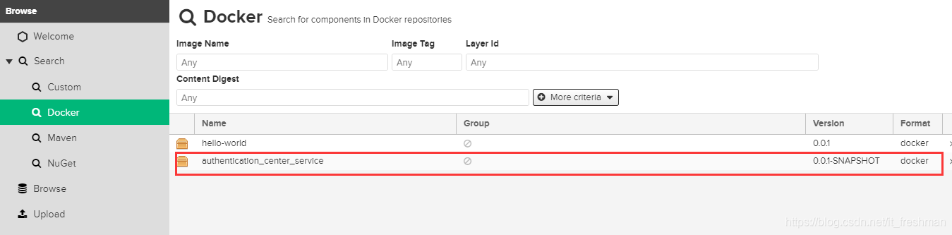將上文打上tag標(biāo)簽的鏡像,推送到私服nexus:mvn clean docker:push -Dmaven.test.skip=true -DskipDockerBuild -DskipDockerTag