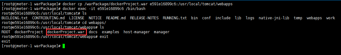 docker cp /warPackage/dockerProject.war e591e16899c6:/usr/local/tomcat/webapps