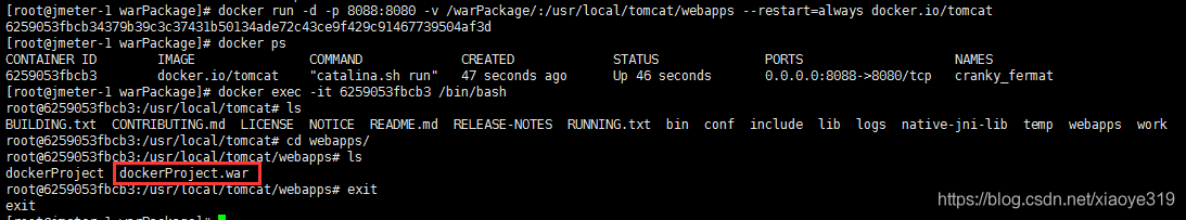 docker run -d -p 8088:8080 -v /warPackage/:/usr/local/tomcat/webapps --restart=always docker.io/tomcat