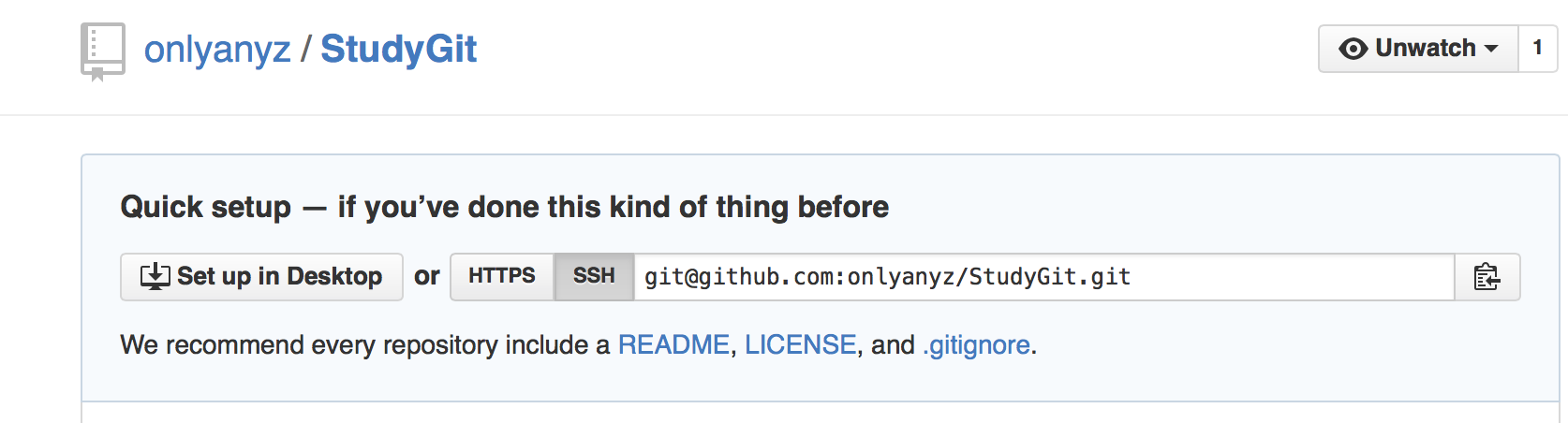 可以看到有一個(gè)ssh地址是git@github.com:onlyanyz/StudyGit.git,這個(gè)就是我們的遠(yuǎn)程git倉(cāng)庫(kù)地址了,一會(huì)我們就會(huì)把文件推送到這里。