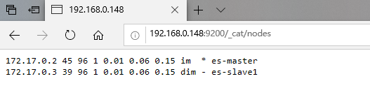 訪問http://IP:9200/_cat/nodes確認(rèn)查看ES集群信息,可以看到有主從節(jié)點(diǎn)部署成功: