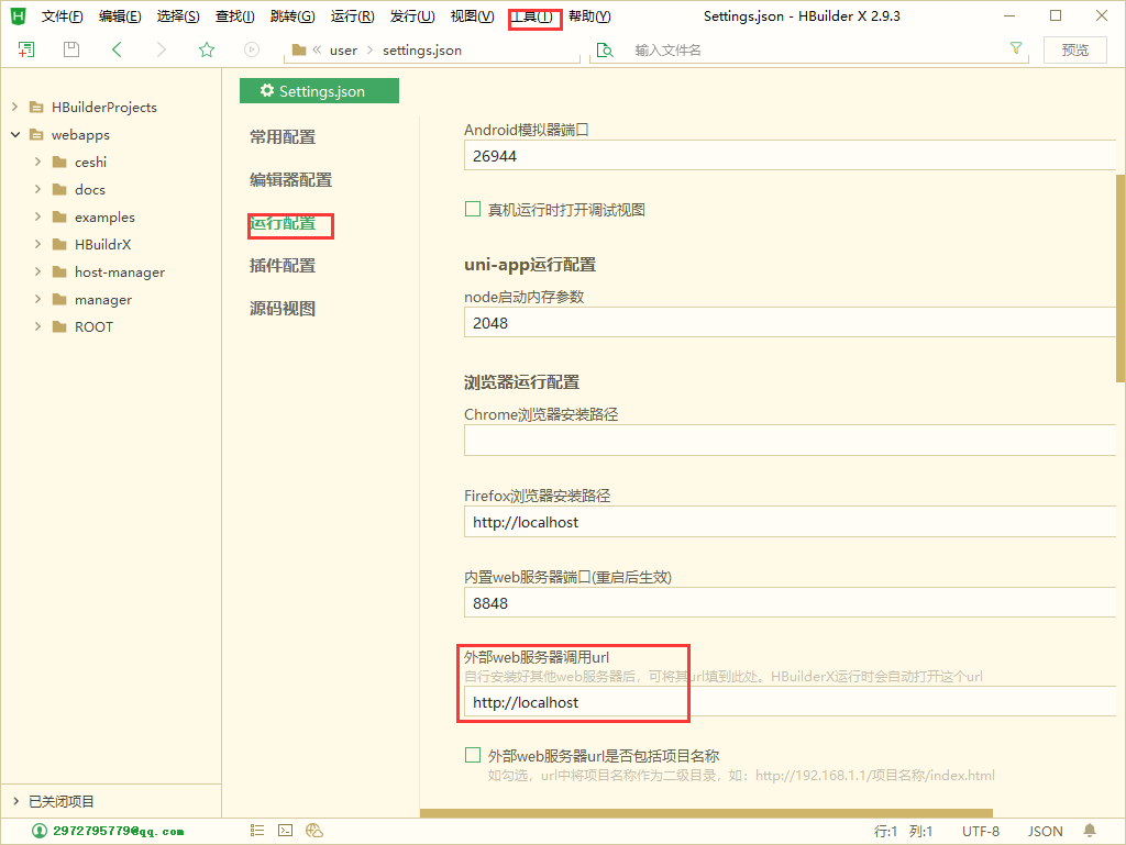打開工具設(shè)置,找運(yùn)行設(shè)置,外部web服務(wù)器調(diào)用url,輸入http://localhost:8080后面的端口號(hào)是自己tomcat的默認(rèn)端口,如果沒有修改過就是8080,我因?yàn)樾薷某?0端口(80端口可不寫),所以配置中并未填寫,注意下面的選項(xiàng),外部web服務(wù)器url是否包含項(xiàng)目名,如果你在引入時(shí)沒有引到webpps這一級(jí)目錄,而是他的下一級(jí)目錄則需要勾選。