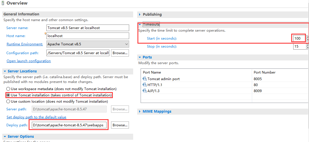雙擊下方的tomcat,進(jìn)入配置頁面,我們發(fā)現(xiàn)Server Locations 是灰的,沒關(guān)系,我們只需要移除tomcat下的項(xiàng)目并clean就可以進(jìn)行配置,具體操作為右鍵tomcat,有ADD and Remove 以及Clean。清除成功后,我們選擇中間的選項(xiàng) Use Tomcat installation,真正部署到tomcat下,在Deploy path 選擇tomcat下的webapps目錄,最后我們可以設(shè)置右上角的timeouts為100防止項(xiàng)目過大啟動(dòng)時(shí)間長(zhǎng),判斷響應(yīng)超時(shí),最后的最后保存。
