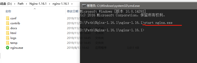 3.在當前目錄下(D:\Path\Nginx-1.16.1\nginx-1.16.1),打開命令窗口,執(zhí)行 start nginx.exe 或者直接執(zhí)行 nginx.exe 即可啟動Nginx