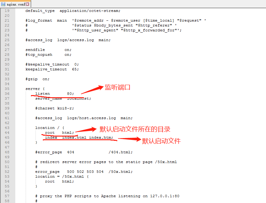 6.2 Nginx默認啟動網(wǎng)頁是index.html(在html文件夾內(nèi),可以通過Nginx配置文件nginx.conf進行配置修改)