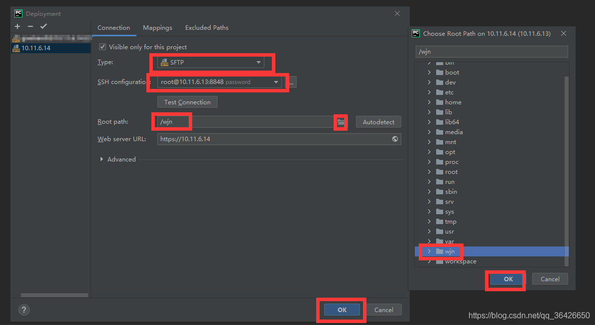 返回到上一個(gè)頁面,選擇配置好的ssh后,可以再選擇需要pycharm關(guān)聯(lián)到容器內(nèi)的具體的目錄。例如博主直接選擇在創(chuàng)建容器時(shí)域宿主機(jī)進(jìn)行關(guān)聯(lián)的目錄/wjn作為pycharm可更新上傳的位置,最后保存即可。