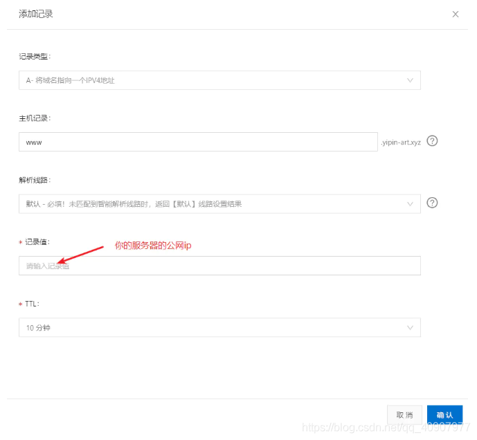 然后把你的服務(wù)器的公網(wǎng)ip地址解析進(jìn)來,點(diǎn)擊確認(rèn)