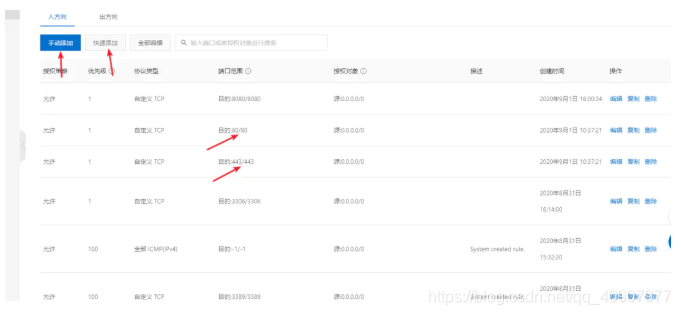 點(diǎn)擊手動添加或者快速添加,添加默認(rèn)端口80和443端口進(jìn)來,保存