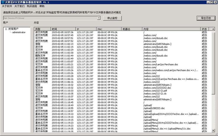 如果你想監(jiān)控FTP服務(wù)器文件訪問操作情況,則可以部署大勢至FTP文件服務(wù)器監(jiān)控軟件(下載地址:http://www.grabsun.com/ftpjk.html),只需要在FTP服務(wù)器上安裝之后,就可以全面監(jiān)控FTP服務(wù)器文件訪問日志,可以記錄修改FTP服務(wù)器文件、刪除ftp服務(wù)器文件以及下載ftp服務(wù)器和上傳ftp服務(wù)器文件等行為,從而便于管理員實(shí)時掌握ftp服務(wù)器文件使用情況,保護(hù)FTP服務(wù)器文件安全。如下圖所示: