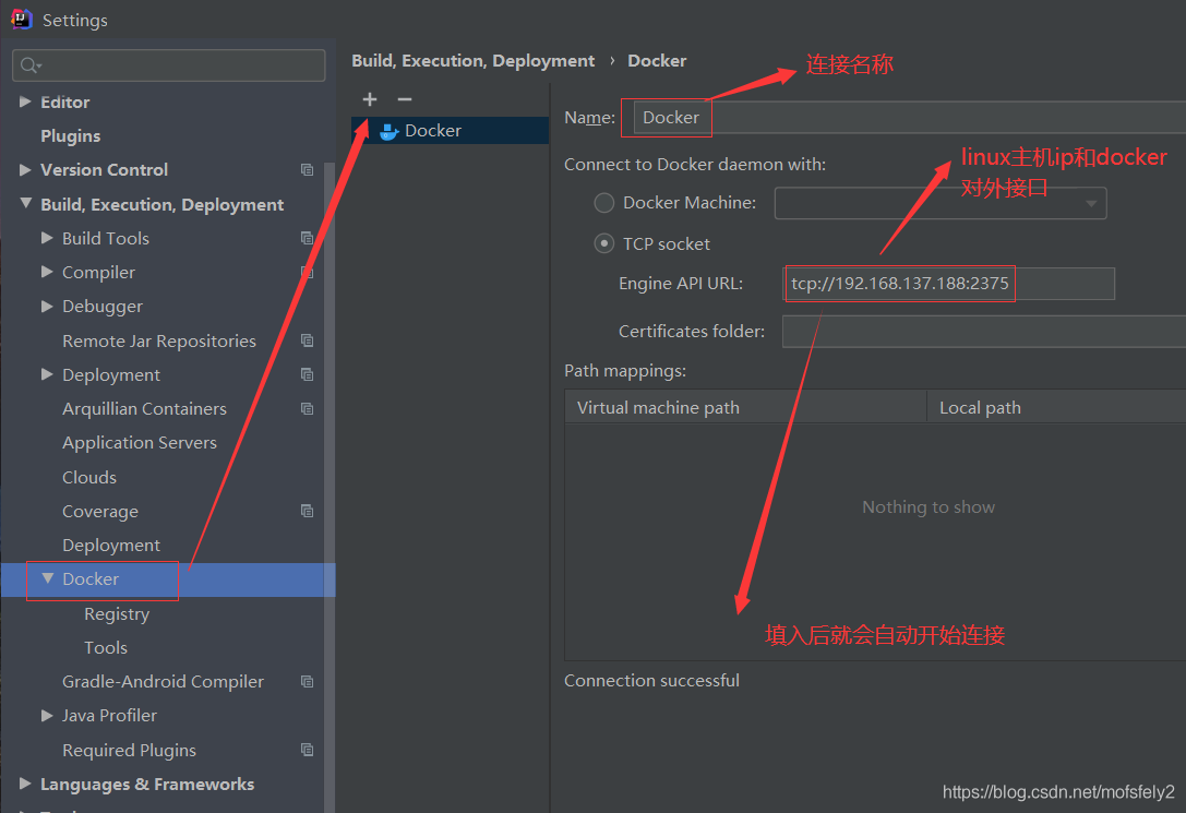 注:docker— 點(diǎn)擊“+”后,填入連接名稱和linux主機(jī)ip:docker對(duì)外端口