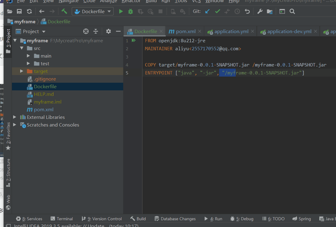 FROM openjdk:8u212-jre MAINTAINER aliyu<2557170552@qq.com> COPY target/myframe-0.0.1-SNAPSHOT.jar /myframe-0.0.1-SNAPSHOT.jar ENTRYPOINT ["java", "-jar", "/myframe-0.0.1-SNAPSHOT.jar"]