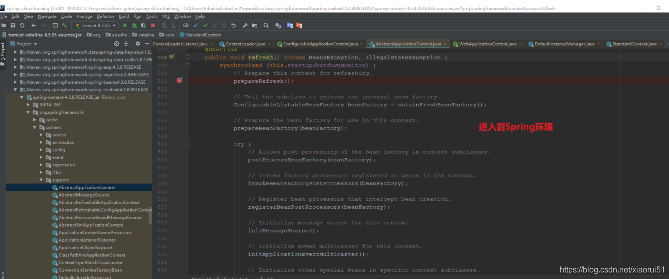 首先在自己項目中被tomcat回調(diào)的接口實現(xiàn)類中,標(biāo)記一個斷點信息,通過idea啟動web項目,當(dāng)出現(xiàn)如圖所示的斷點信息的時候,因為斷點位置標(biāo)記的是tomcat回調(diào)的接口類,所以按照調(diào)用堆棧網(wǎng)上則是tomcat內(nèi)部代碼,但此時雙擊org.apache.catalina包下面的類名,是沒有任何反應(yīng)的,因為我們還沒有將tomcat對應(yīng)的依賴文件添加到classpath下面