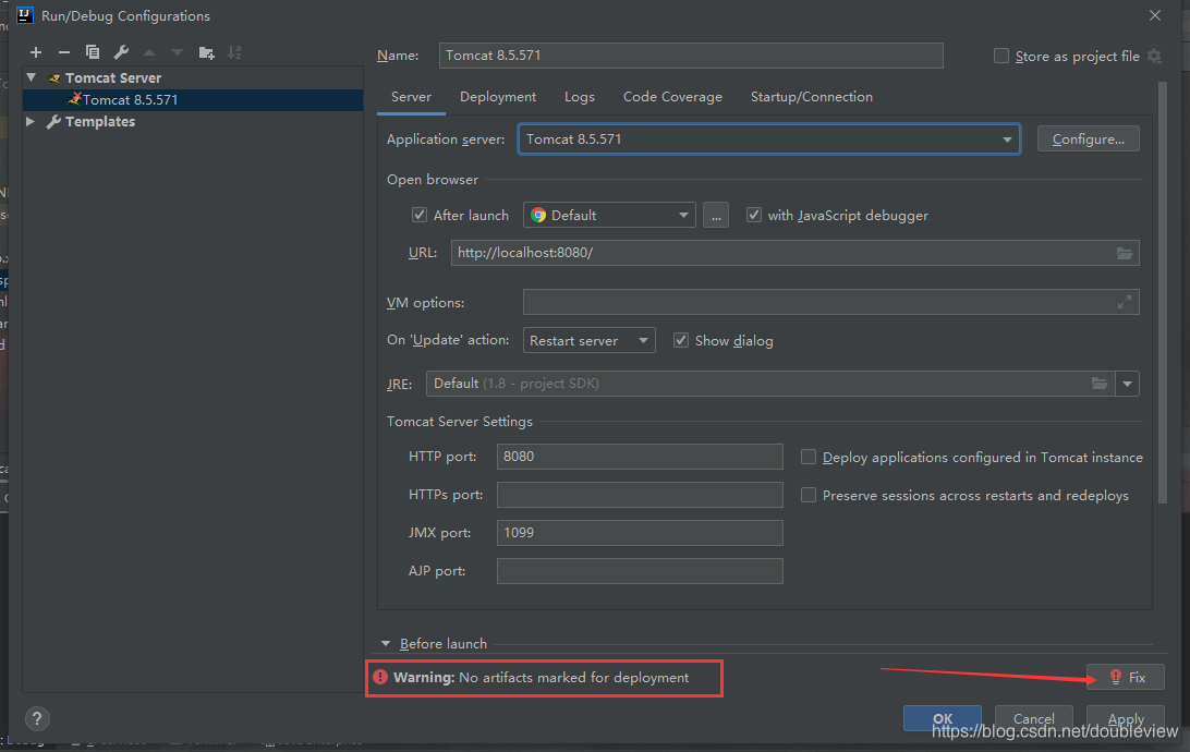 這時可以看到下方有警告Warning: No artifacts marked for deployment,直接點擊右邊的Fix修復,之后跳到Deployment面板