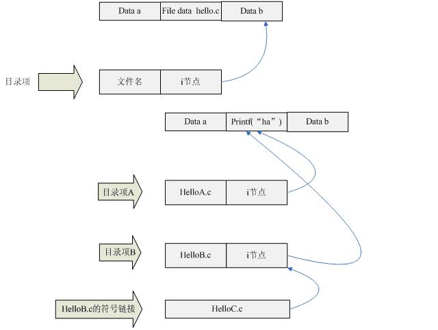 我們可以通過(guò)一個(gè)圖來(lái)看看目錄項(xiàng),inode,文件數(shù)據(jù)四者之間的關(guān)系。
