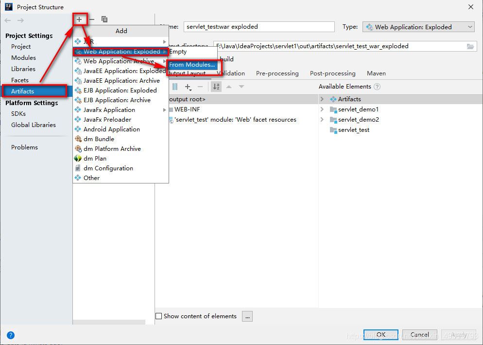 左擊file,找到project Setting,左擊Artifacts,點加號,點Web Application:Exploded ,再點From Modules… ,選擇要選的項目,點擊ok!