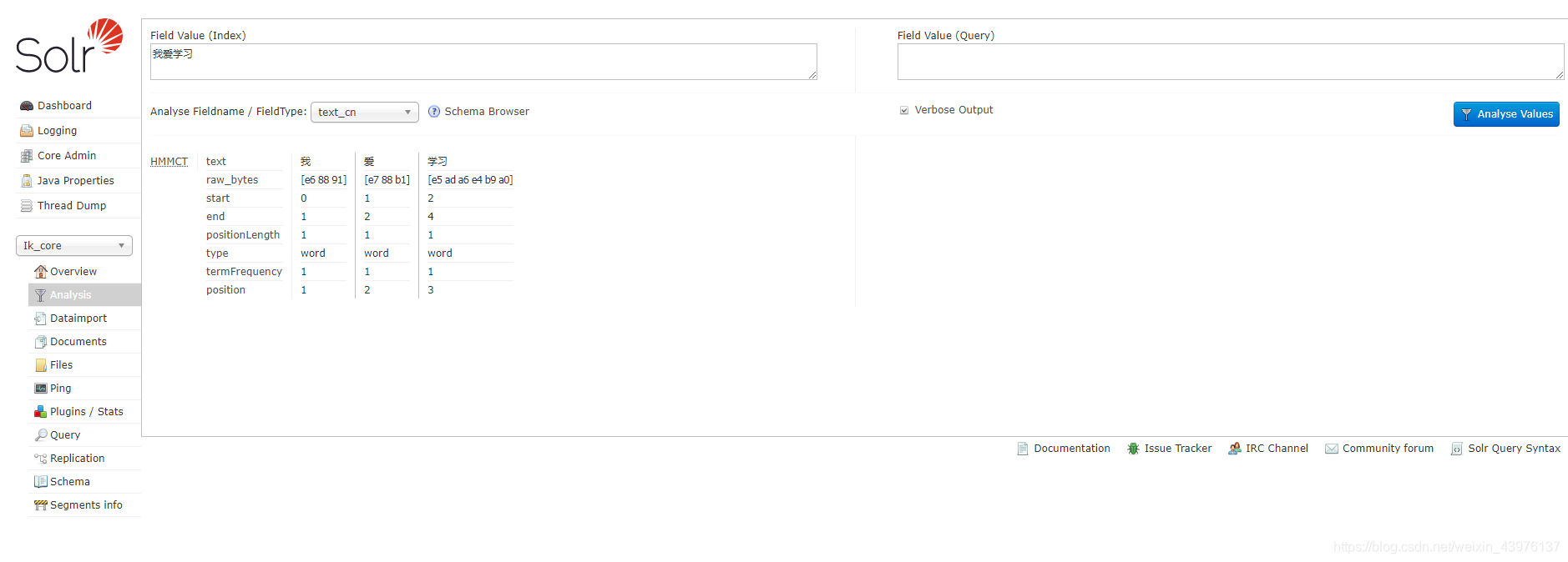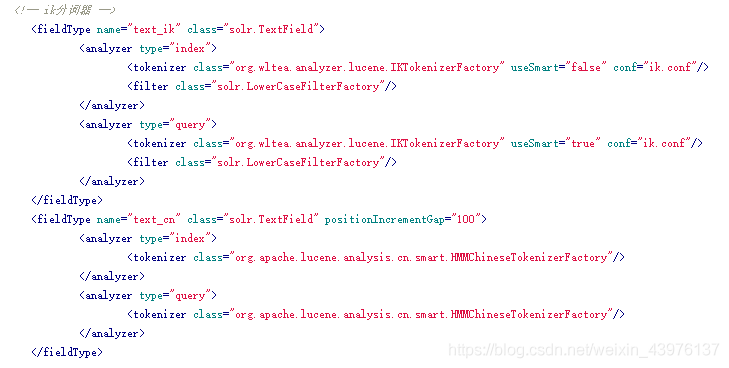 <!-- ik分詞器 --> <fieldType name="text_ik" class="solr.TextField"> <analyzer type="index"> <tokenizer class="org.wltea.analyzer.lucene.IKTokenizerFactory" useSmart="false" conf="ik.conf"/> <filter class="solr.LowerCaseFilterFactory"/> </analyzer> <analyzer type="query"> <tokenizer class="org.wltea.analyzer.lucene.IKTokenizerFactory" useSmart="true" conf="ik.conf"/> <filter class="solr.LowerCaseFilterFactory"/> </analyzer> </fieldType> <fieldType name="text_cn" class="solr.TextField" positionIncrementGap="100"> <analyzer type="index"> <tokenizer class="org.apache.lucene.analysis.cn.smart.HMMChineseTokenizerFactory"/> </analyzer> <analyzer type="query"> <tokenizer class="org.apache.lucene.analysis.cn.smart.HMMChineseTokenizerFactory"/> </analyzer> </fieldType>