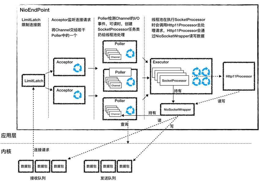 在 Tomcat 中 NioEndpoint 則是 AbstractEndpoint 的具體實(shí)現(xiàn),里面組件雖然很多,但是處理邏輯還是前面兩步。它一共包含 LimitLatch、Acceptor、Poller、SocketProcessor和 Executor 共 5 個(gè)組件,分別分工合作實(shí)現(xiàn)整個(gè) TCP/IP 協(xié)議的處理。
