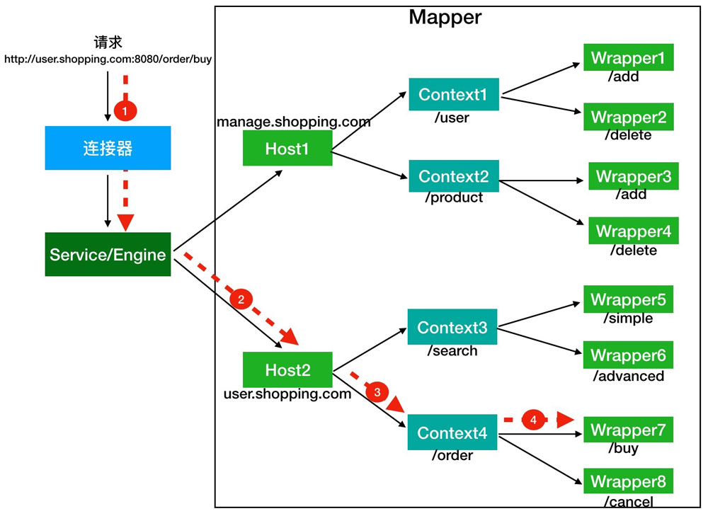 Wrapper 表示一個(gè) Servlet ,Context 表示一個(gè) Web 應(yīng)用程序,而一個(gè) Web 程序可能有多個(gè) Servlet ;Host 表示一個(gè)虛擬主機(jī),或者說一個(gè)站點(diǎn),一個(gè) Tomcat 可以配置多個(gè)站點(diǎn)(Host);一個(gè)站點(diǎn)( Host) 可以部署多個(gè) Web 應(yīng)用;Engine 代表 引擎,用于管理多個(gè)站點(diǎn)(Host),一個(gè) Service 只能有 一個(gè) Engine。