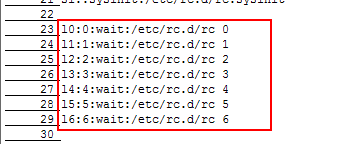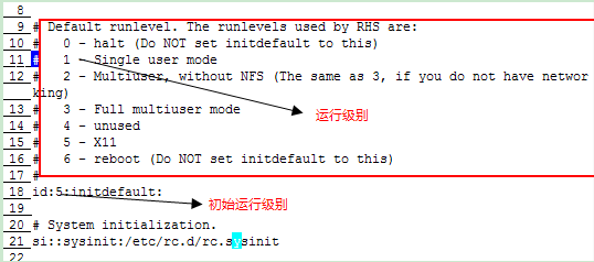 1 initdefault:指定系統(tǒng)缺省啟動的運(yùn)行級別,如上圖中標(biāo)出,通常用于修復(fù),比如我們要進(jìn)入單用戶模式,則可以將其設(shè)置為1,不可將默認(rèn)設(shè)置為0或6,否則無法啟動.