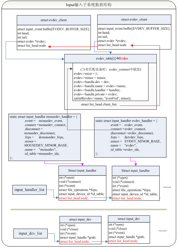 事件處理層為不同硬件類型提供了用戶訪問及處理接口。例如當我們打開設備/dev/input/mice時,會調用到事件處理層的Mouse Handler來處理輸入事件,這也使得設備驅動層無需關心設備文件的操作,因為Mouse Handler已經有了對應事件處理的方法。