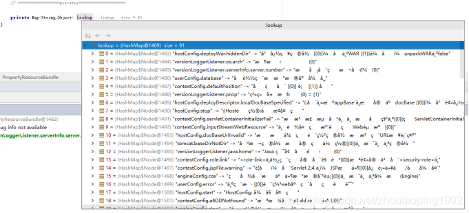 最終發(fā)現(xiàn)所有的值存在了PropertyResourceBundle類的lookup的map集合中,集合中的數(shù)據(jù)已經(jīng)亂碼了。