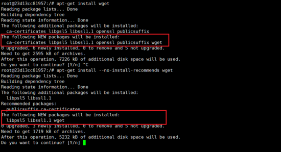 我們以apt為例,apt-get在安裝軟件的時候,可以指定一個選項: --no-install-recommends ,指定這個參數(shù)后,有一些非必須的依賴將不會被一起安裝。比如,我們安裝wget時,如果增加這個選項,待安裝的包將從6個減少為3個: