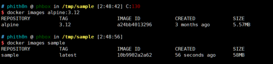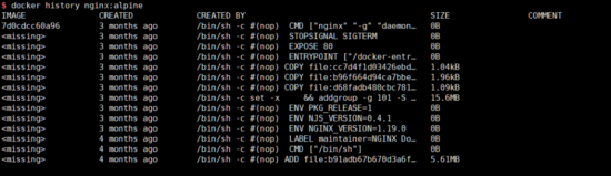 相比起來,正常的alpine:3.12只有5.57MB,說明即使我們已經(jīng)刪除了 /sample.dat 文件,在最后的鏡像中也沒有這個內(nèi)容,但是它永遠(yuǎn)留在了鏡像的history中。